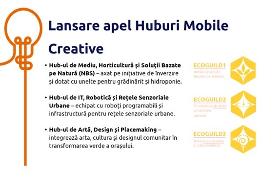 Sub sloganul „Adu un Hub Mobil Creativ în școala ta!” invităm școlile și profesorii să se înscrie în programul Huburile Mobile Creative – EcoGuilds, o inițiativă care aduce trei platforme educaționale mobile în curtea școlilor și în spațiile comunității.