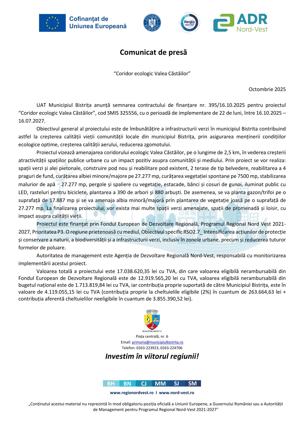UAT Municipiul Bistrița anunță semnarea contractului de finanțare nr. 395/16.10.2025 pentru proiectul “Coridor ecologic Valea Căstăilor”, cod SMIS 325556, cu o perioadă de implementare de 22 de luni, între 16.10.2025 – 16.07.2027.