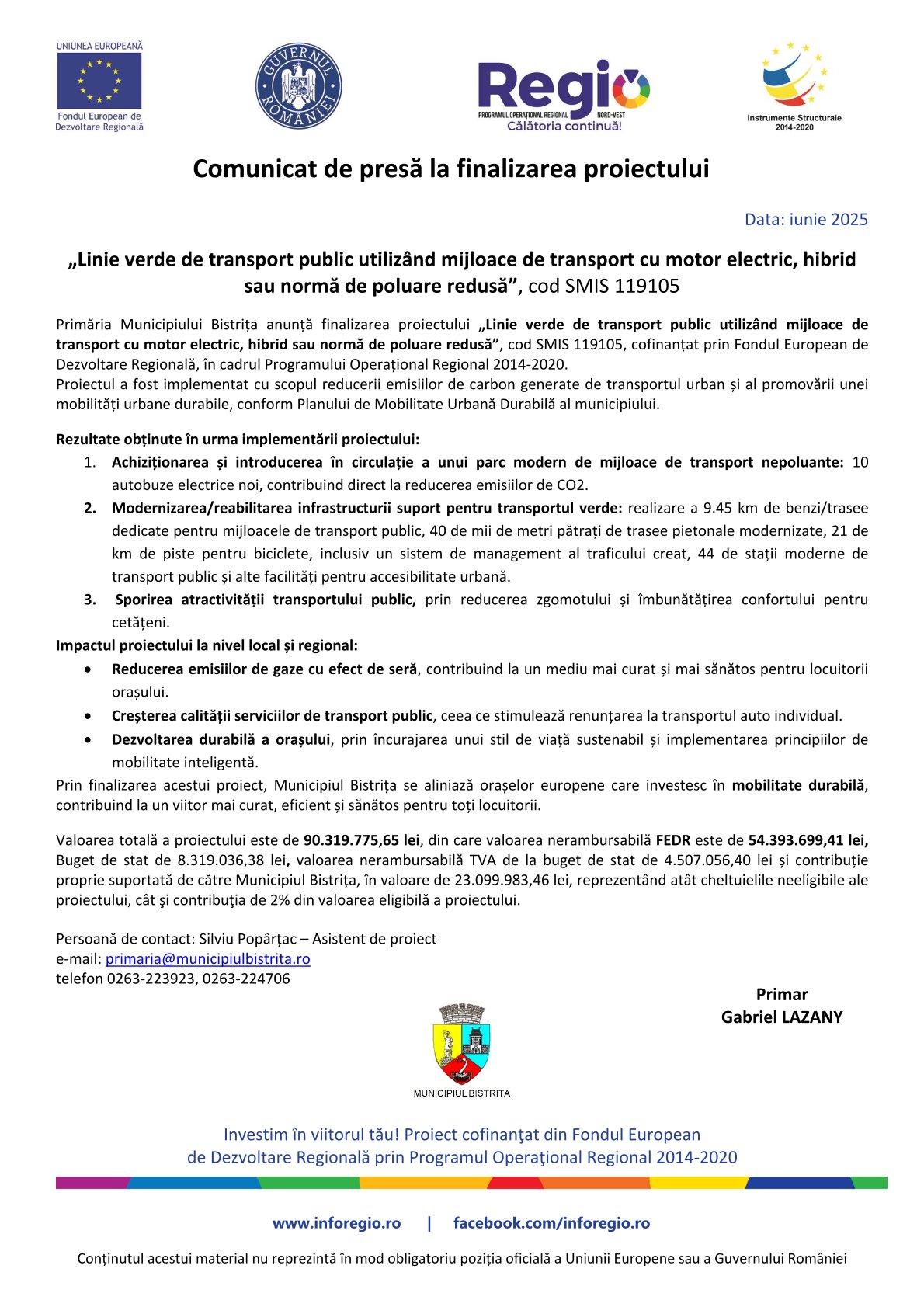 Comunicat de presă la finalizarea proiectului – Linie verde de transport public utilizând mijloace de transport cu motor electric, hibrid sau normă de poluare redusă