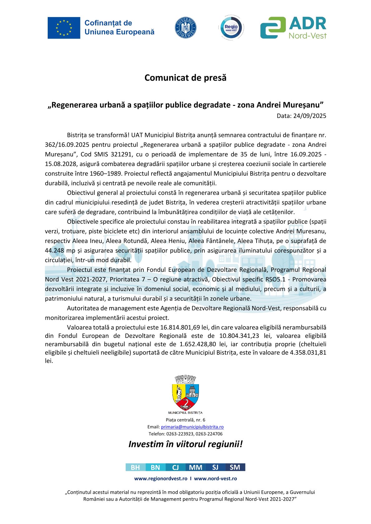 Bistrița se transformă! UAT Municipiul Bistrița anunță semnarea contractului de finanțare nr. 362/16.09.2025 pentru proiectul „Regenerarea urbană a spațiilor publice degradate – zona Andrei Mureșanu”, Cod SMIS 321291, cu o perioadă de implementare de 35 de luni, între 16.09.2025 – 15.08.2028, asigură combaterea degradării spațiilor urbane și creșterea coeziunii sociale în cartierele construite între 1960–1989. Proiectul reflectă angajamentul Municipiului Bistrița pentru o dezvoltare durabilă, incluzivă și centrată pe nevoile reale ale comunității.